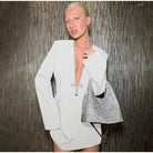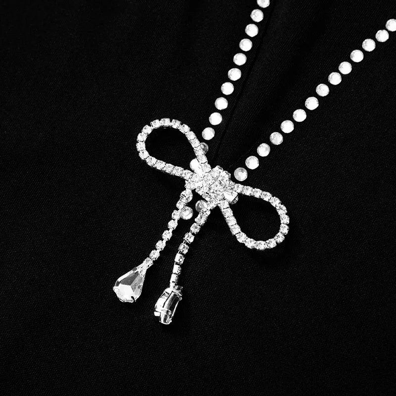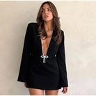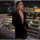 Çarpıcı kristal süslemelerle vurgulanan cüretkar bir dalma yakaya sahip bu şık siyah mini elbise ile cesur bir açıklama yapın. Özel kesim ve uzun kollu olarak tasarlanan bu elbise, zarafet ve şıklığın mükemmel bir karışımıdır. Parıldayan kristal fiyonk detayı lüks bir dokunuş katarak elbiseyi lüks etkinlikler ve göz alıcı akşamlar için ideal hale getirir.