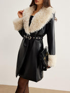 Şık deri görünümlü tasarımı ve yaka ile manşetlerdeki yumuşak kürk detaylarıyla dikkat çeken bu kaban, zarafeti ve sıcaklığı bir araya getiriyor. Belde tokalı tasarımıyla stilinizi öne çıkarın!