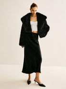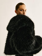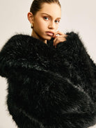 Modern ve şık bir tarz sunan bu siyah kısa faux kürk ceket, yumuşak dokusuyla hem konfor hem de stil vadediyor. Özel günler ve davetlerde zarafetinizi tamamlamak için ideal bir seçenek!