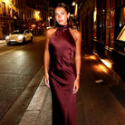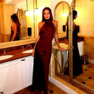 Sırt dekolteli şık bir tasarıma ve zengin, lüks bir renk tonuna sahip bu çarpıcı halter yakalı saten maksi elbise ile bir açıklama yapın. Akşam etkinlikleri, partiler veya göz alıcı bir gece için mükemmel olan bu elbise, zarafet ve sofistike bir görünüm sergiler. Zamansız, baş döndürücü bir görünüm için minimal takılar ve topuklu ayakkabılarla kombinleyin.