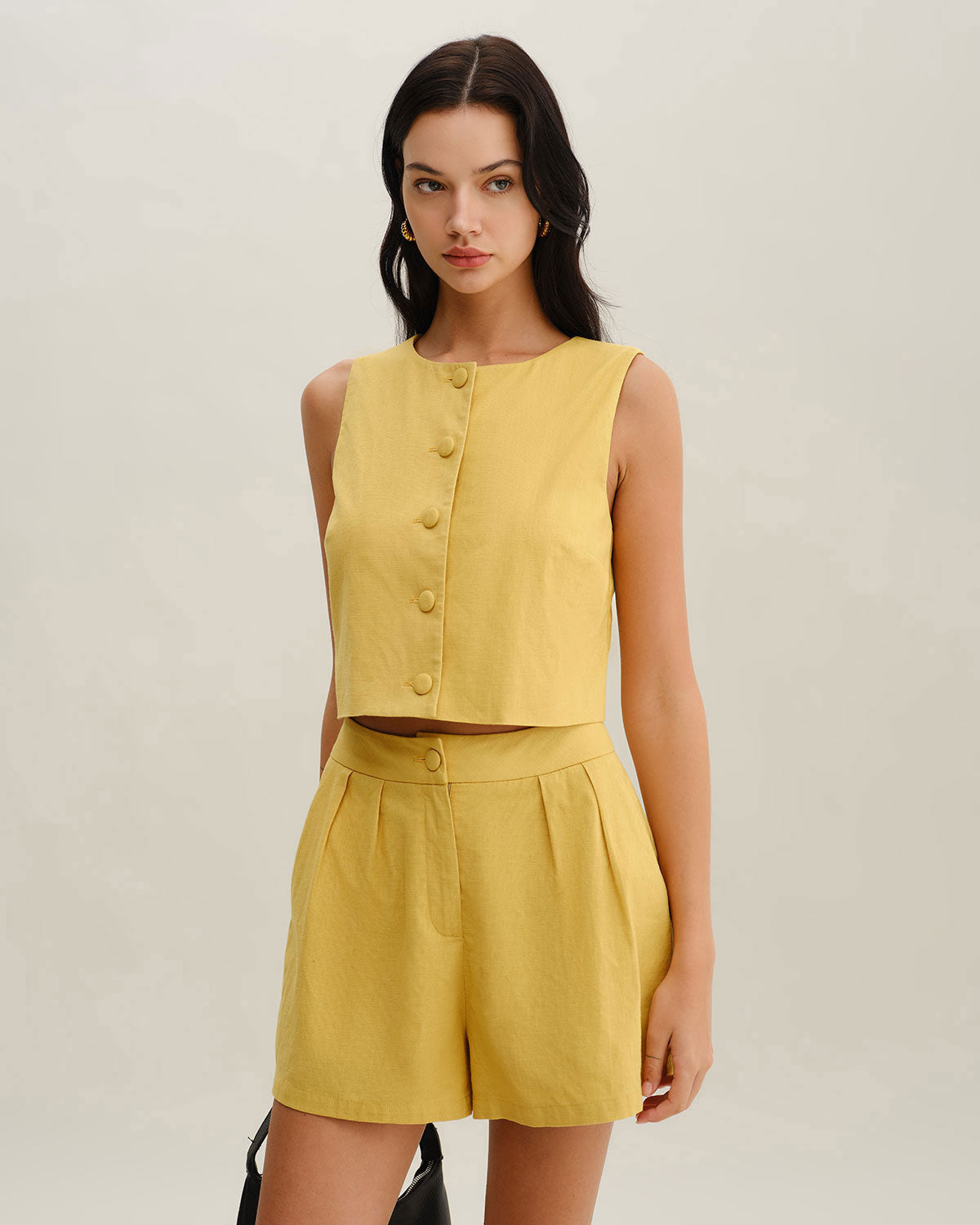 Sarı Büzgülü Düğmeli Şort