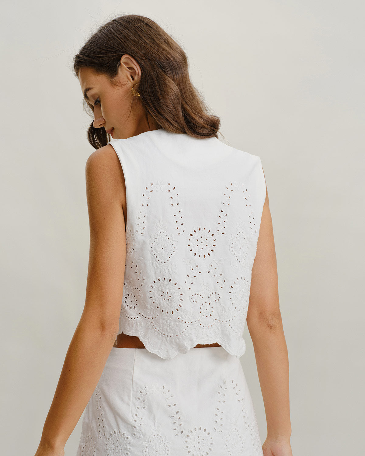 Beyaz Nakışlı V Yaka Düğmeli Yelek