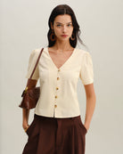 Kadınlar için tasarlanan bej V yakalı, düğmeli, kısa kollu bluz, sadece şık bir üstten daha fazlası; her mevsim tercih edeceğiniz, zamansız bir gardırop parçası. Yüzünüzü çerçeveleyen ve boyun çizginizi uzatan hoş bir V yaka ile tasarlanan bu bluz, zarif altın zincirler veya gösterişli küpeler takmak için mükemmel. Kabarık omuz kolları yumuşak ve feminen bir görünüm kazandırırken, ahşap tarzı düğme sırası, minimalist tasarıma doğal ve el yapımı bir dokunuş katıyor.