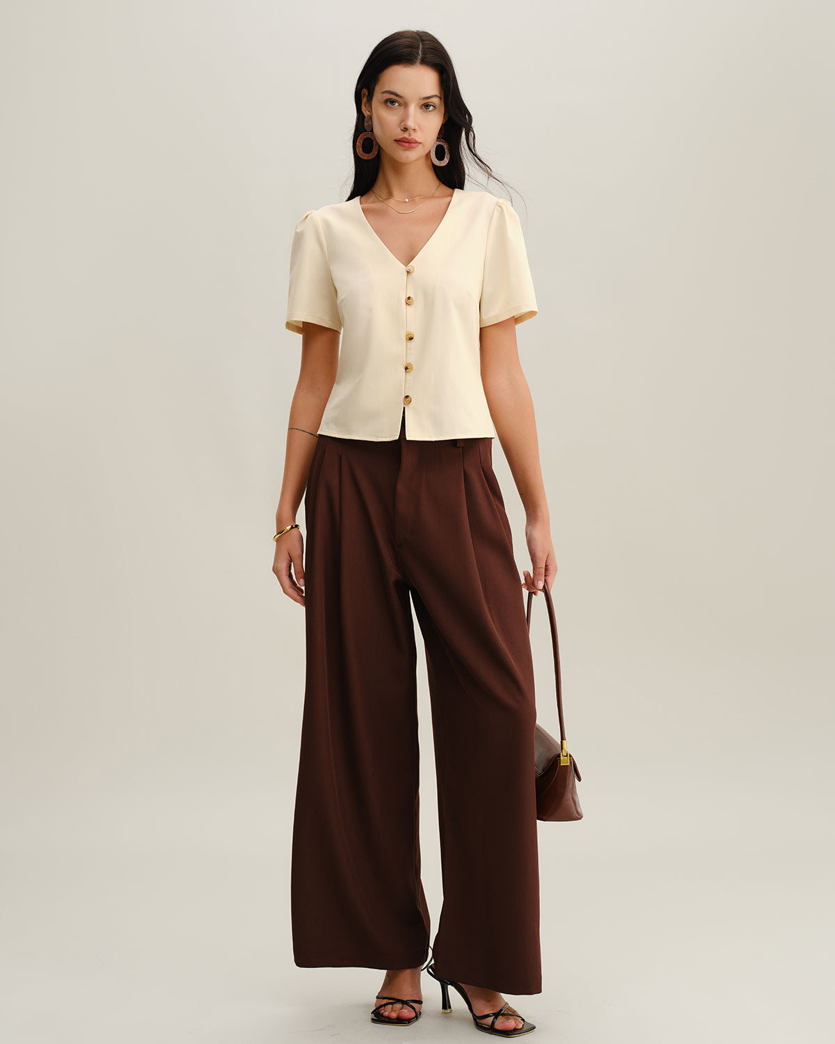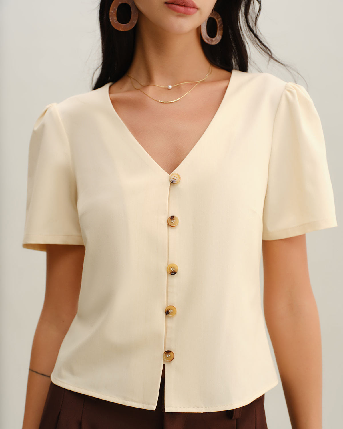 Bej V Yaka Düğmeli Kısa Kollu Bluz