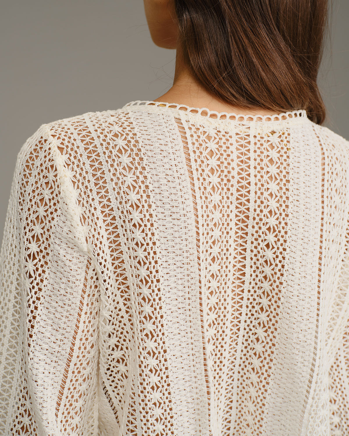 Beyaz Kare Yaka Düğmeli Dantel Bluz