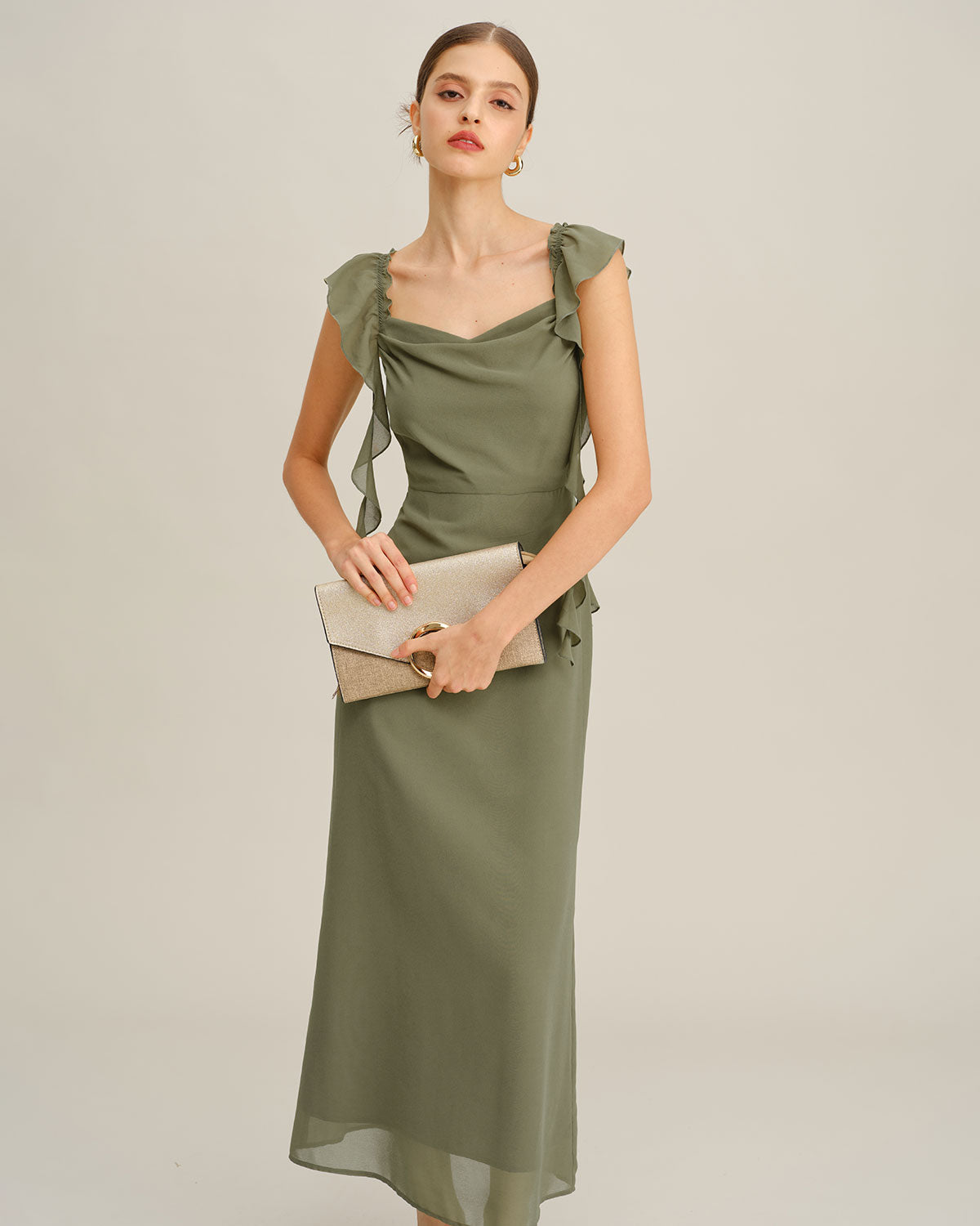 Yeşil Büzgülü Düğmeli Midi Elbise