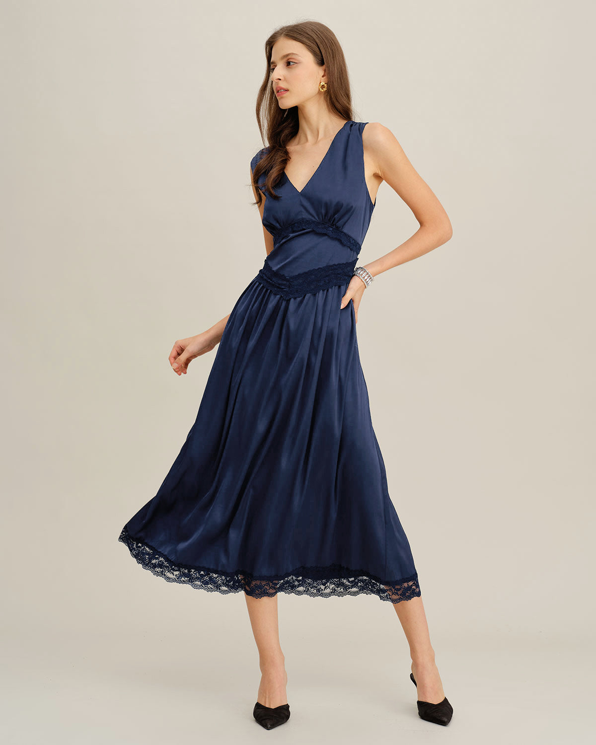 Mavi V Yaka A Kesim Kolsuz Midi Elbise