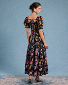 Siyah Çiçekli Kare Yaka Büzgülü Uzun Elbise