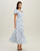 Mavi Çiçekli V Yaka Düğmeli Uzun Elbise