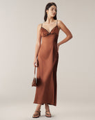 Kahverengi Şifon V Yaka Slip Uzun Elbise