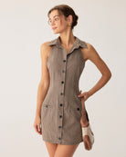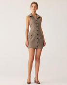 Belltoile™ Kahverengi Ekose Düğmeli Kolsuz Mini Elbise