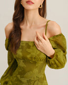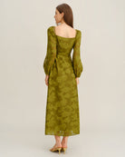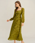 Yeşil Çiçekli Kare Yaka A Kesim Uzun Elbise