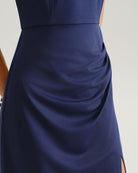 Lacivert Büzgülü Yırtmaçlı Uzun Elbise
