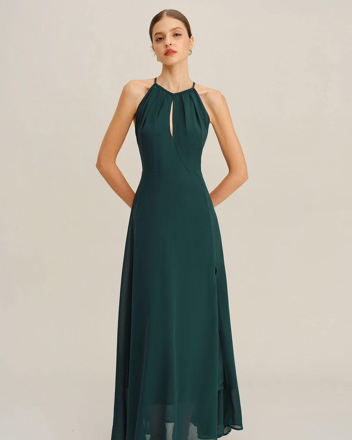 Yeşil Şifon Yırtmaçlı Uzun Elbise