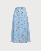 Mavi Çiçekli Yırtmaçlı A Kesim Midi Etek