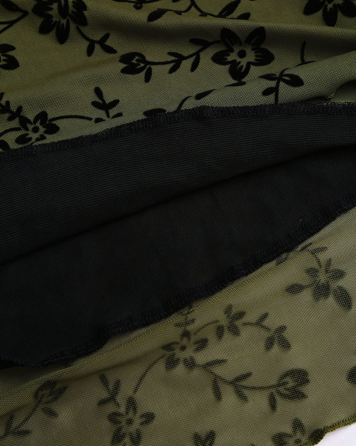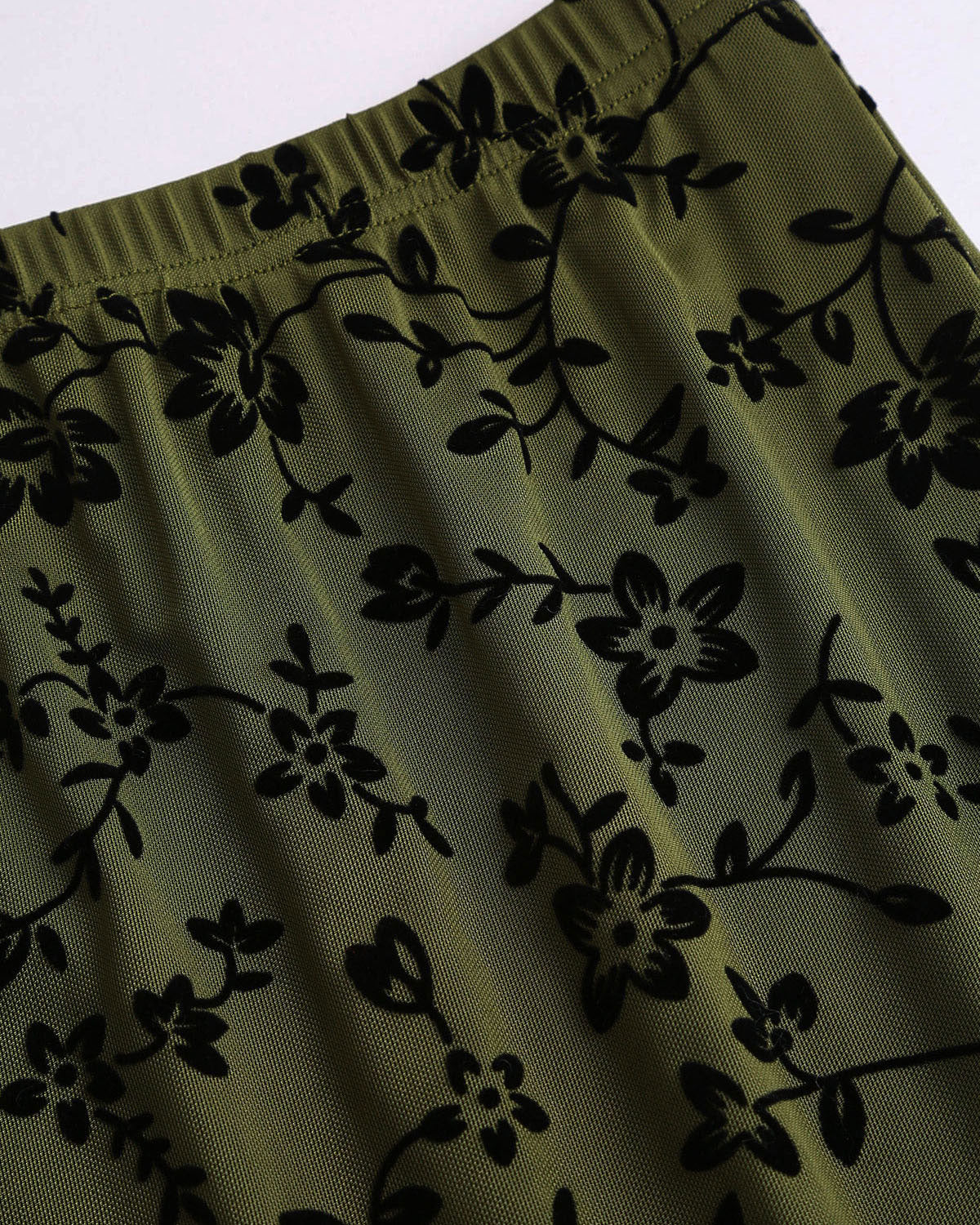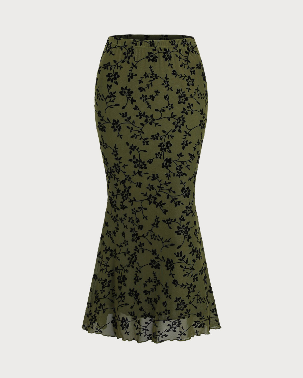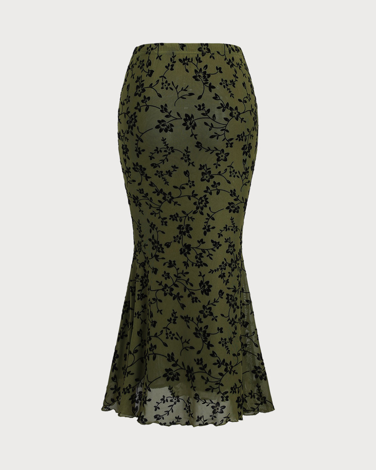 Yeşil Çiçekli Lastikli Bel Denizkızı Midi Etek