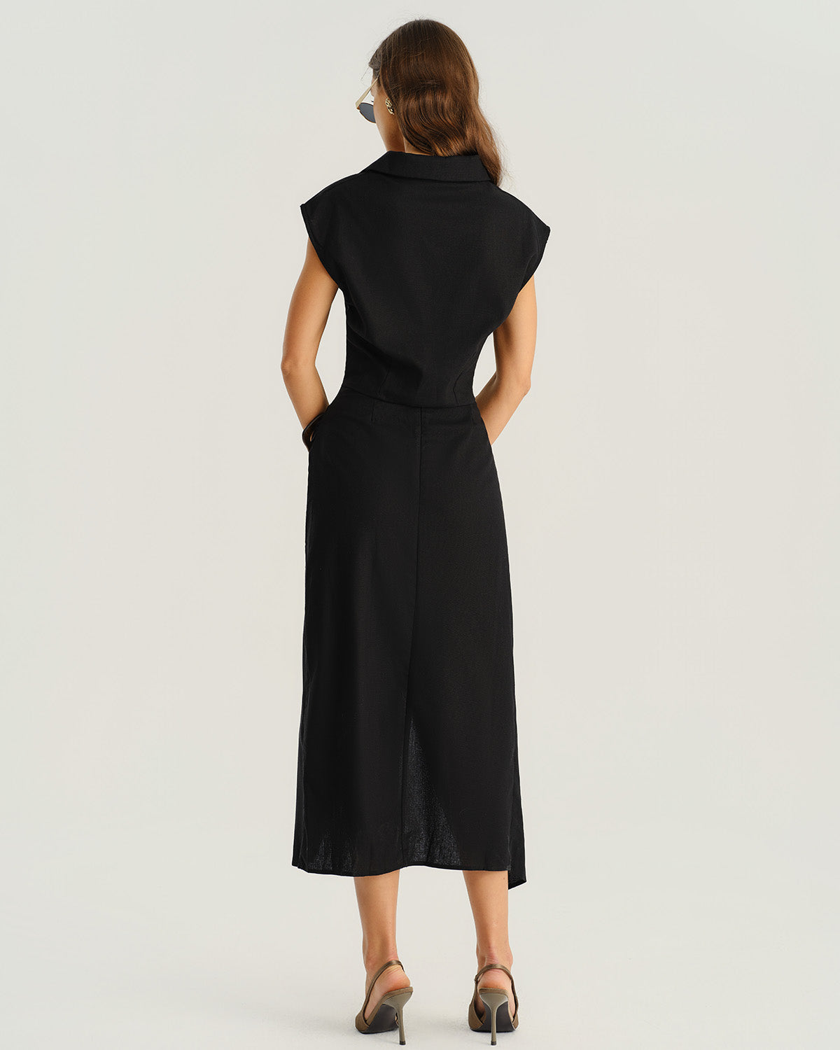 Siyah Doğal Bel Düğmeli Yırtmaçlı Midi Etek