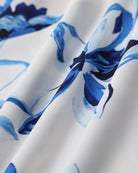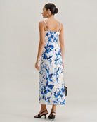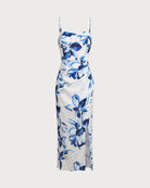 Mavi Çiçekli Bohem Saten Uzun Elbise