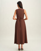 Kahverengi Yuvarlak Yaka Düğmeli Kolsuz Uzun Elbise