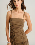 Kahverengi Büzgülü File Askılı Uzun Elbise