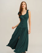 Yeşil Büzgülü A Kesim Kolsuz Uzun Elbise