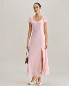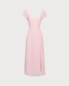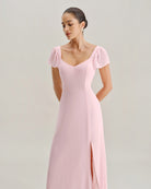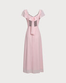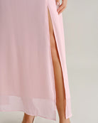Pembe Kalp Yaka Şifon Uzun Elbise