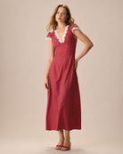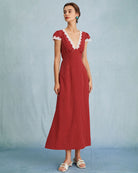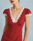 Belltoile™ Kırmızı V Yaka Puantiyeli Dantelli Uzun Elbise
