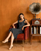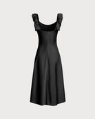 Siyah Volanlı Kare Yaka Midi Elbise