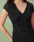 Siyah V Yakalı Puantiyeli Midi Elbise, eğlenceli bir dokunuşla zamansız bir zarafet sunar. Şık V yakası ve klasik puantiye deseniyle bu midi elbise, hem günlük hem de özel günler için mükemmeldir. Akıcı silüeti, gün boyu konfor ve şıklık sağlar.
