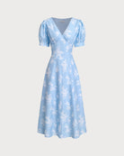Mavi Çiçekli Kabarık Kollu Kıvrımlı Midi Elbise