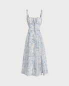 Mavi Çiçekli Büzgülü Midi Elbise
