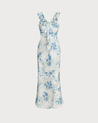 Mavi Çiçekli Volanlı V Yaka Kolsuz Midi Elbise
