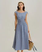 Mavi Ekose Tekne Yaka Büzgülü Midi Elbise