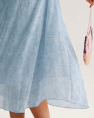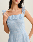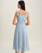 Mavi Kare Yaka Volanlı Midi Elbise