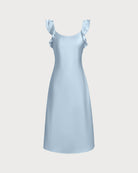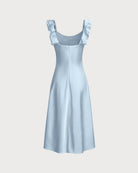 Mavi Kare Yaka Volanlı Saten Midi Elbise