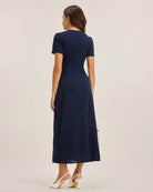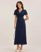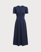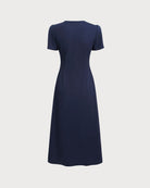 Mavi V Yaka Düğmeli Pileli Midi Elbise