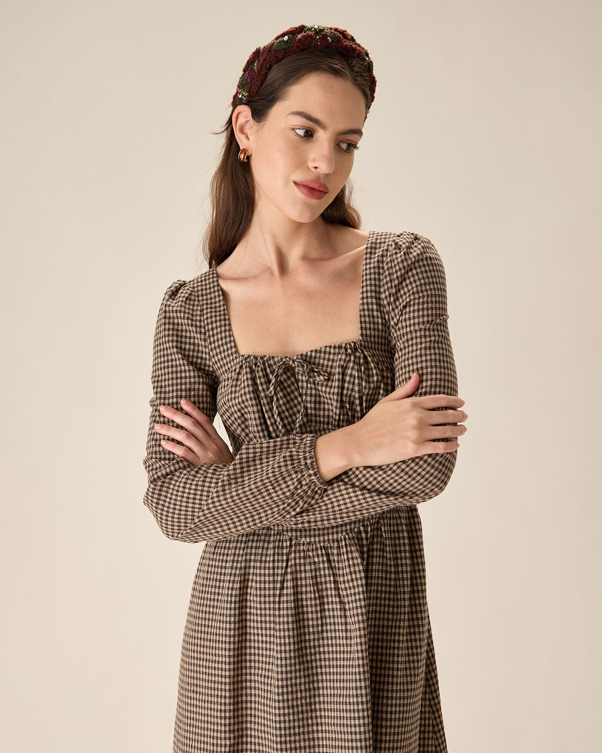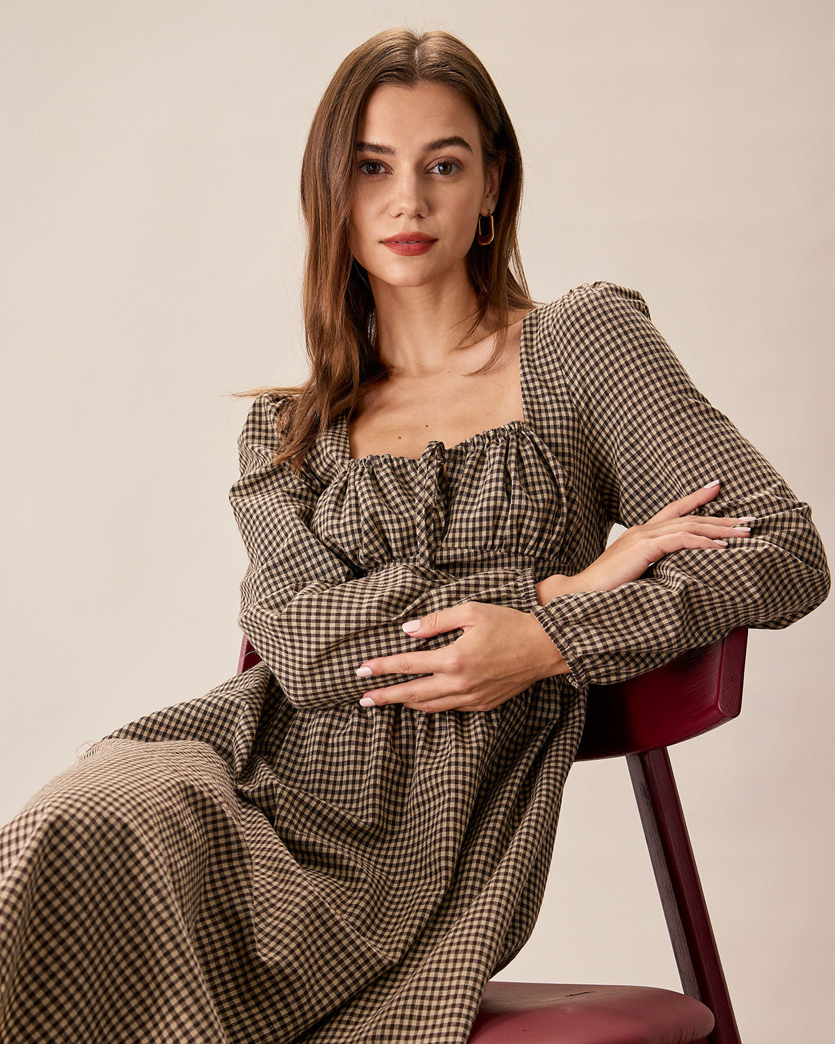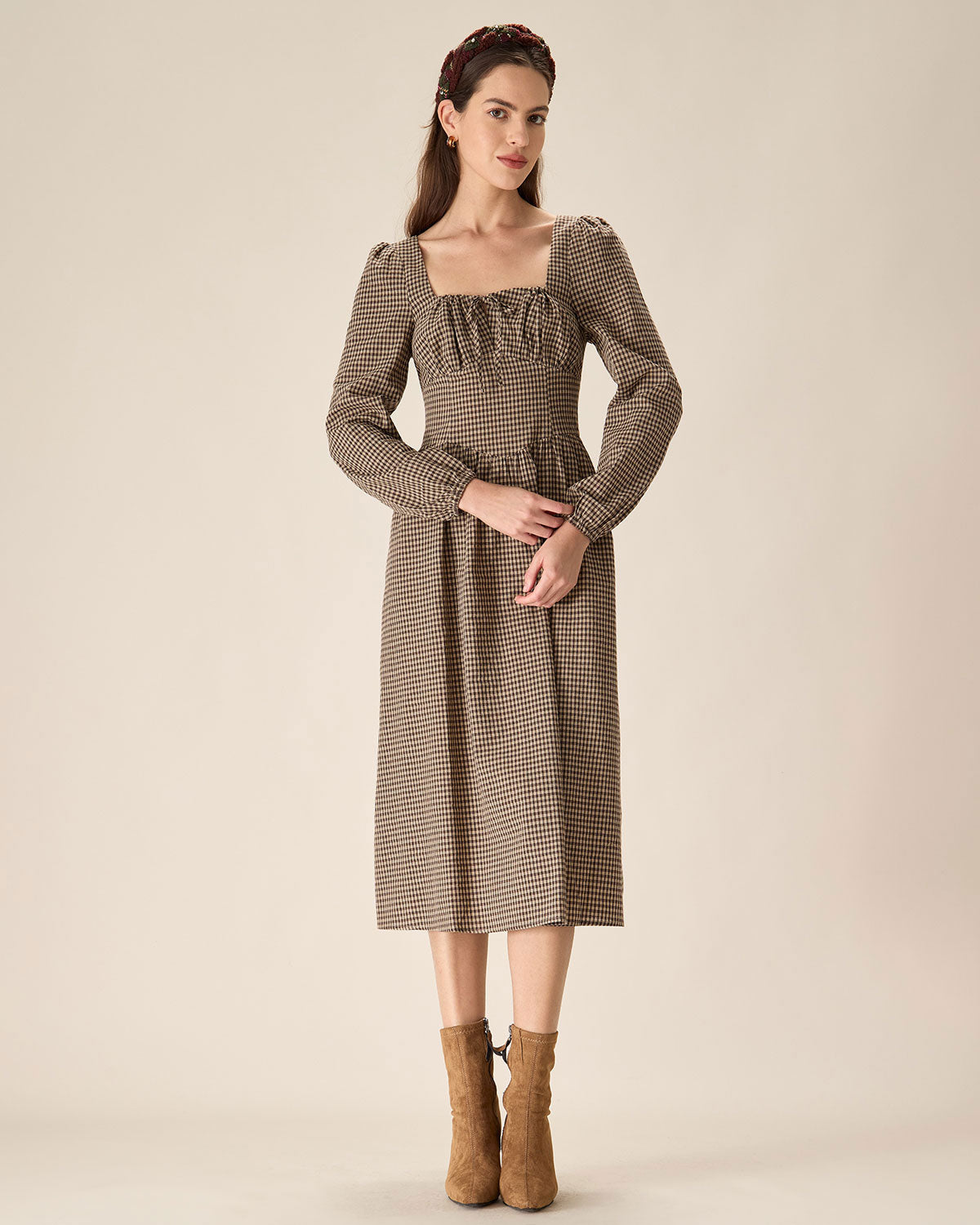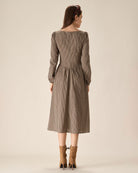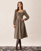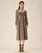 Belltoile™ Kahverengi Ekose Kare Yaka Dantelli Midi Elbise