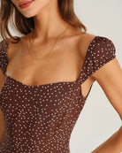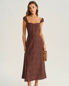 Kahverengi Puantiyeli Kısa Kollu Midi Elbise