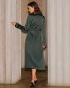 Yeşil Saten Kapüşonlu Yaka Yırtmaçlı Midi Elbise