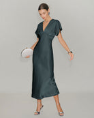 Yeşil Saten Kapüşonlu Kollu Midi Elbise