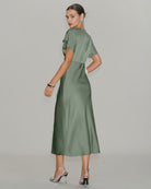 Yeşil Saten V Yaka A Kesim Midi Elbise