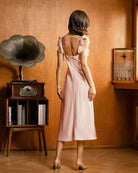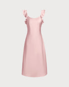 Pembe Kare Yaka Volanlı Saten Midi Elbise