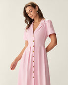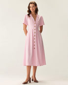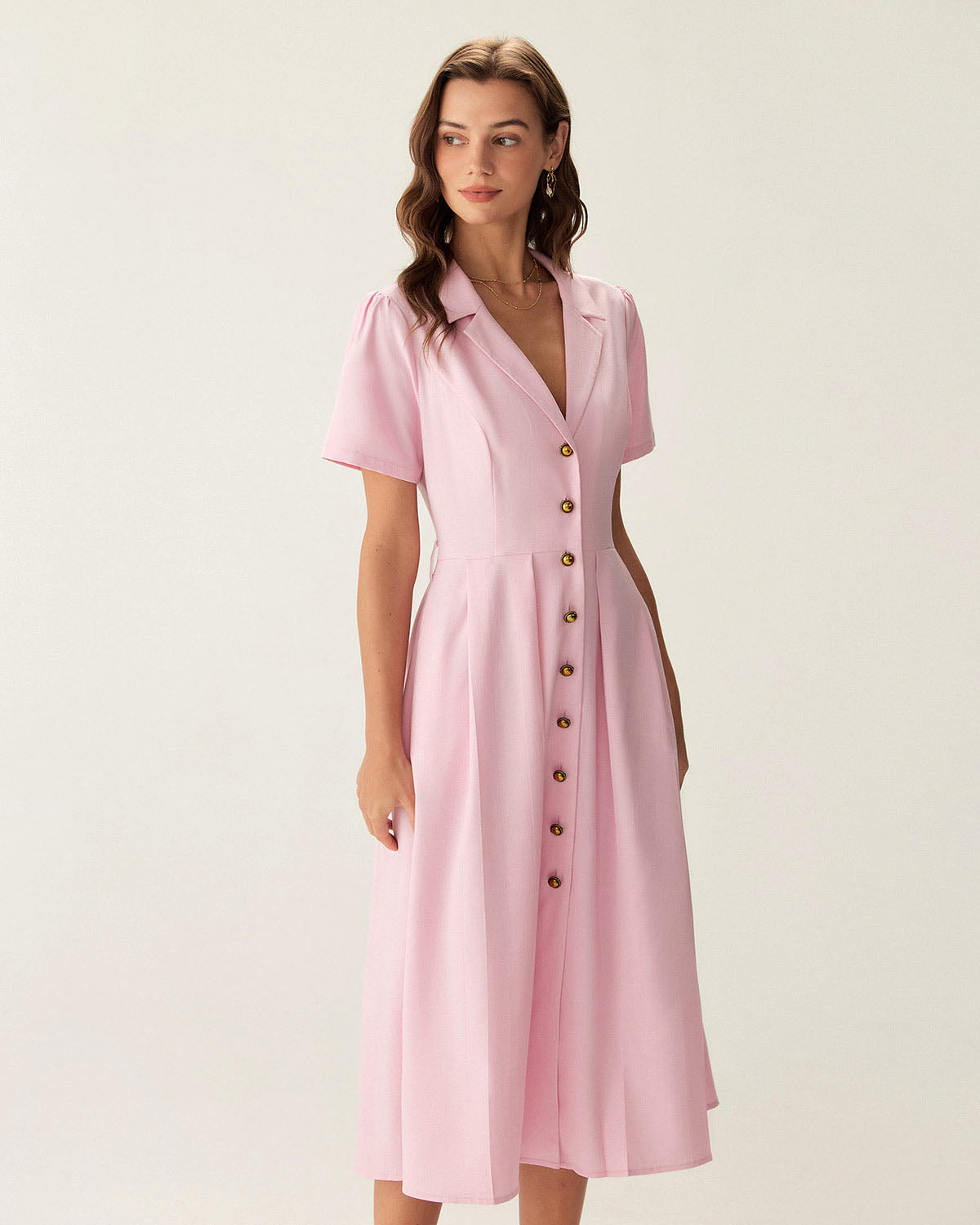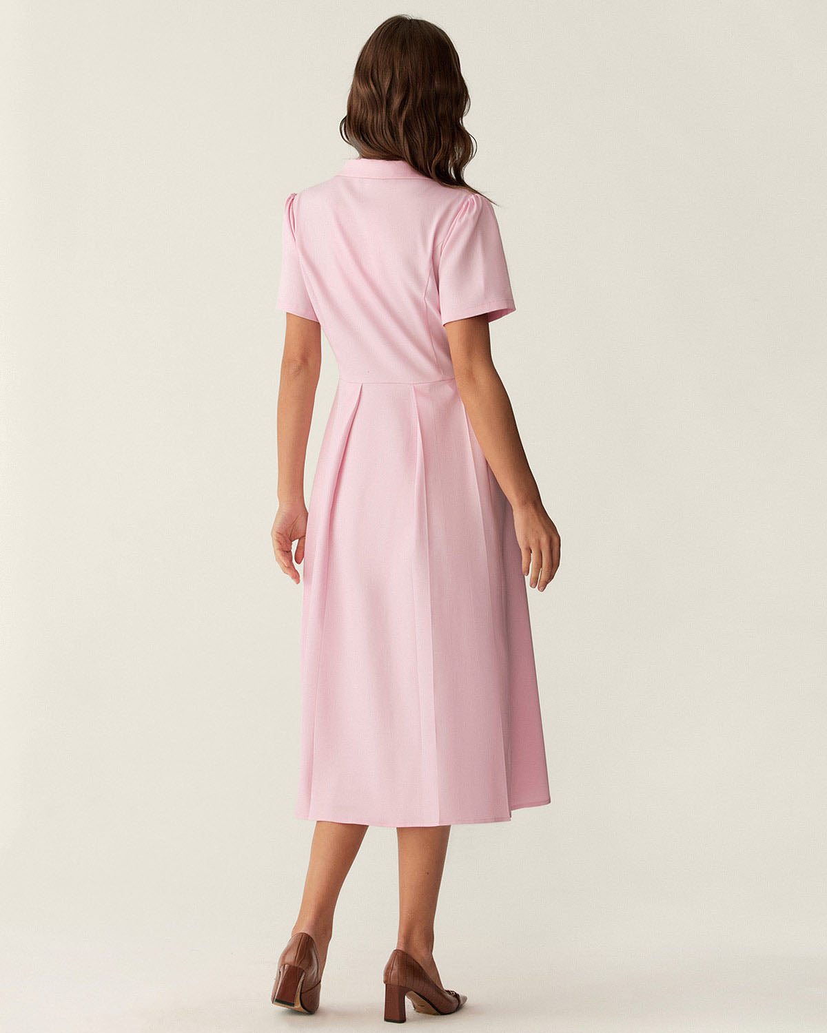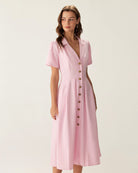 Belltoile™ Pembe V Yaka Pileli Düğmeli Midi Elbise