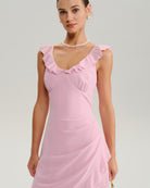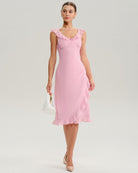 Pembe V Yaka Volanlı Kolsuz Midi Elbise