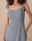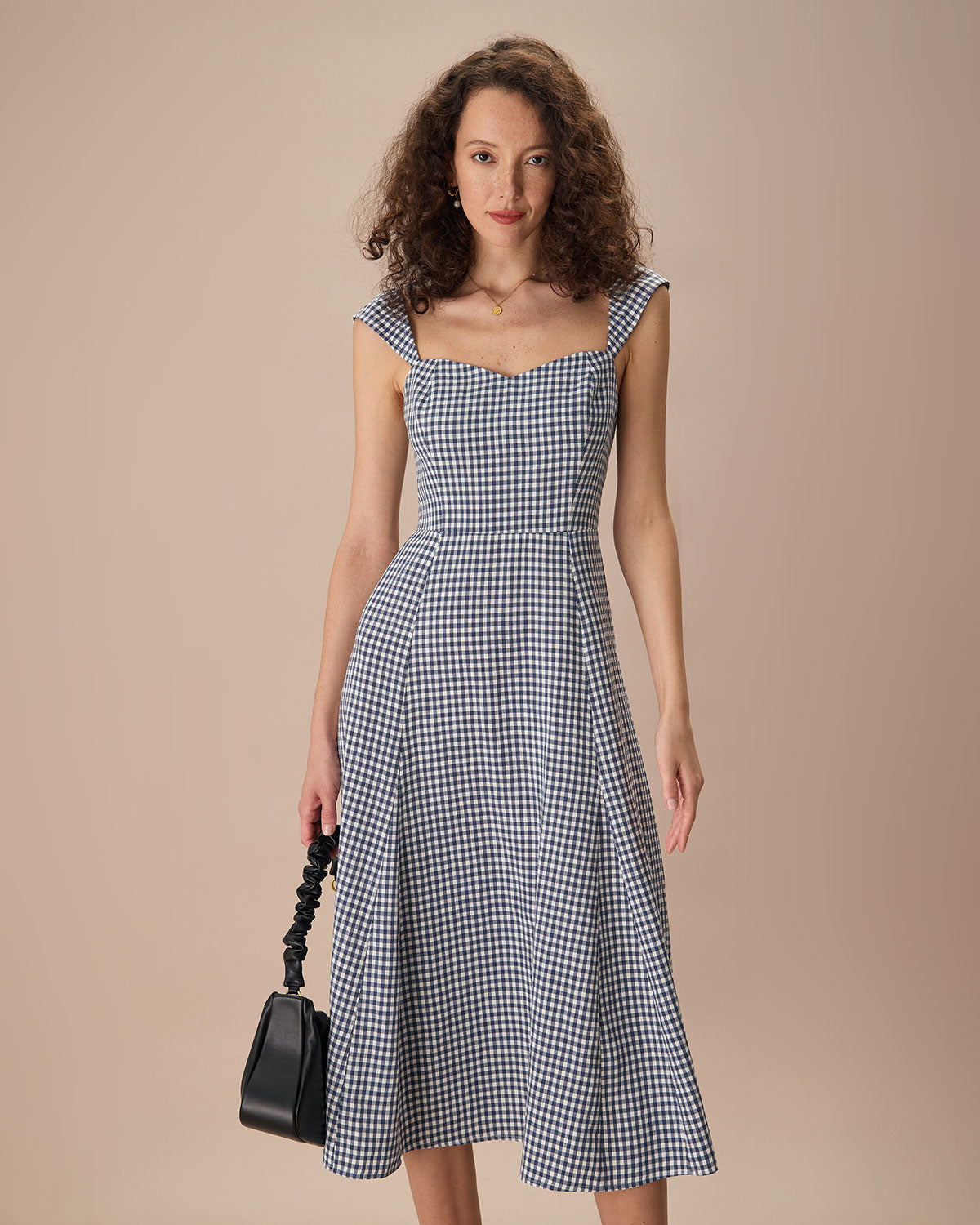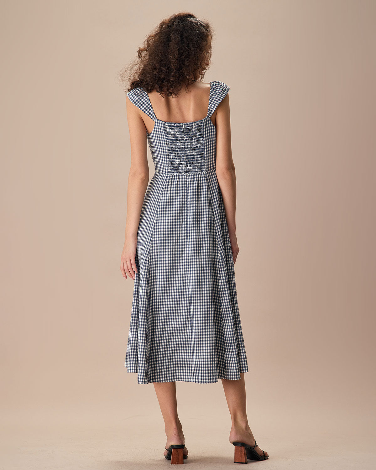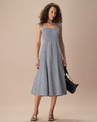 Belltoile™ Lacivert Ekose Sırtı Büzgülü Midi Elbise