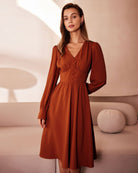 Belltoile™ Turuncu V Yaka Pileli Düğmeli Midi Elbise