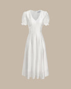 Beyaz Kabarık Kollu V Yaka Midi Elbise