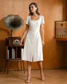 Beyaz Kare Yaka Düğmeli Midi Elbise