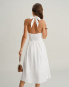 Beyaz V Yaka Askılı Kolsuz Midi Elbise
