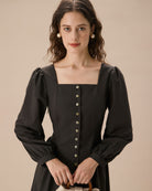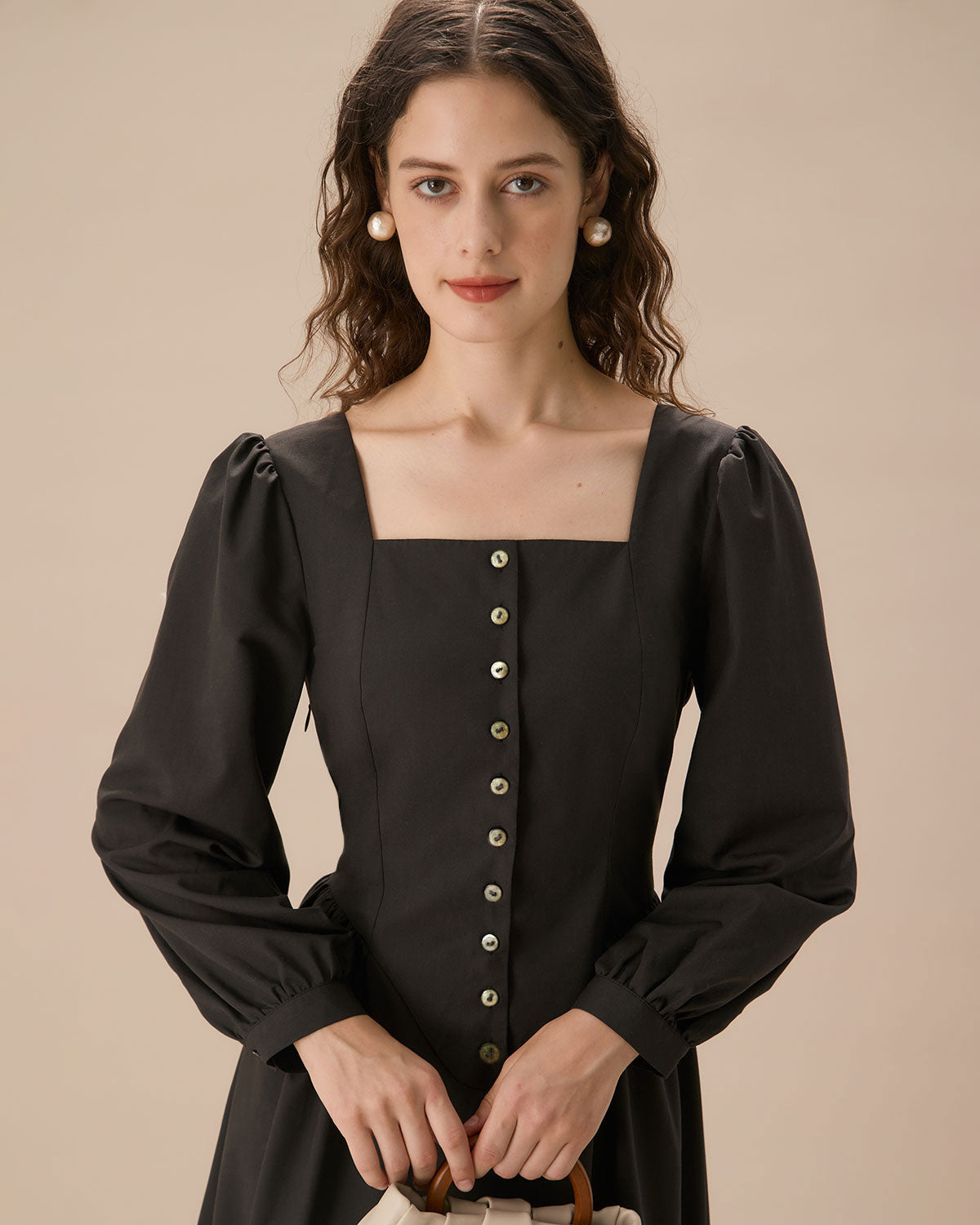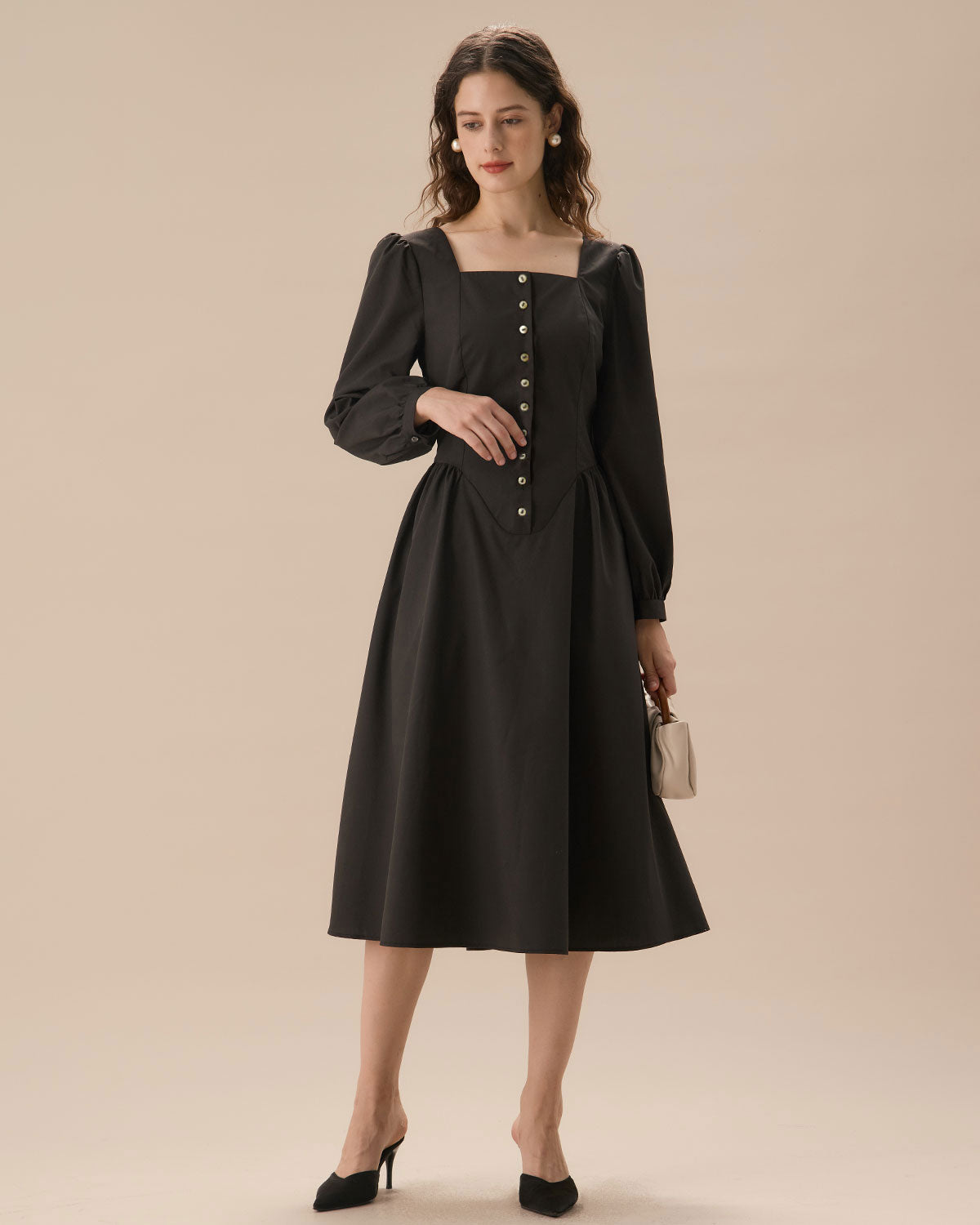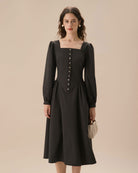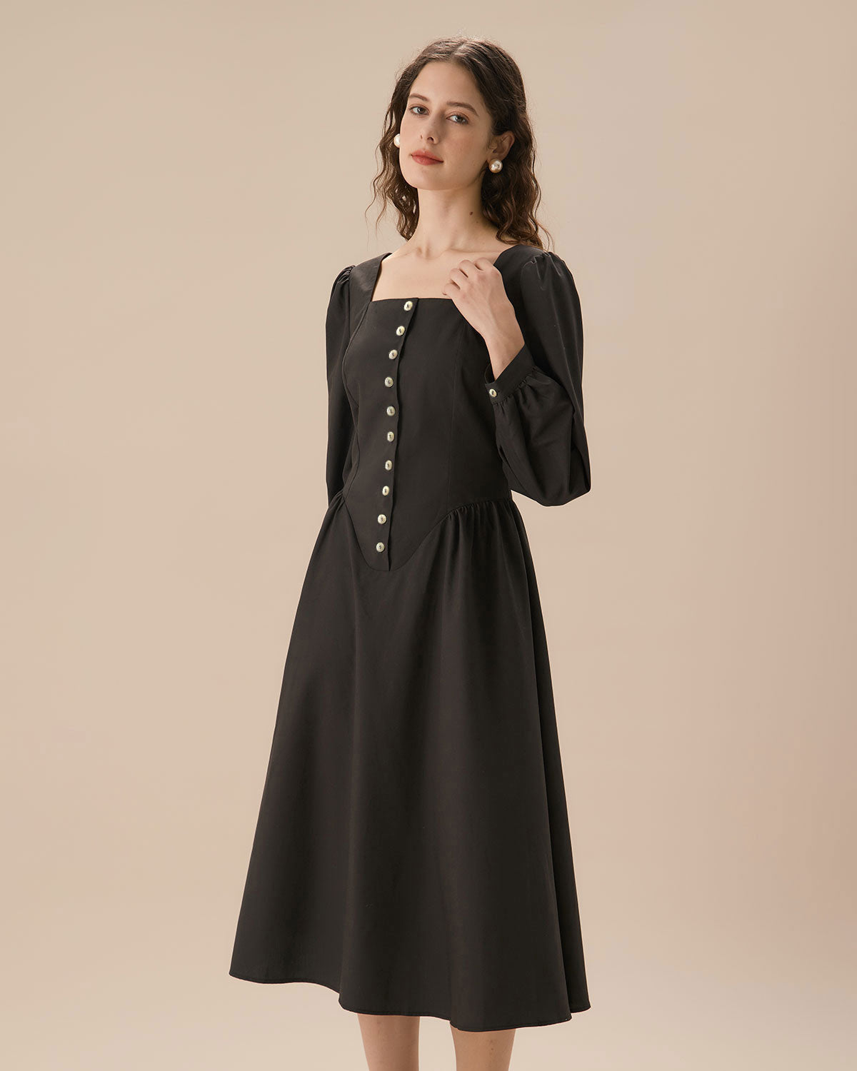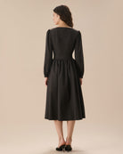 Belltoile™ Siyah Kare Yaka Kabarık Kol Midi Elbise
